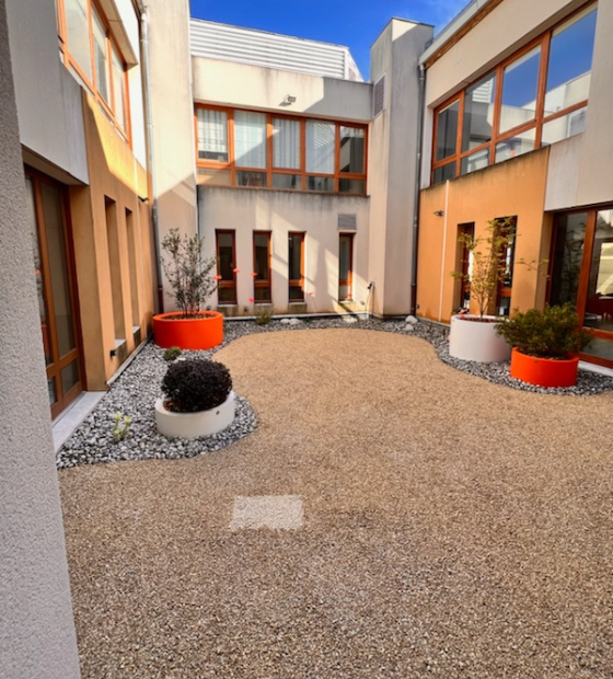 Les aménagements favorisent la rencontre grâce à des bancs, des tables et des cheminements confortables. Les matériaux, simples et chaleureux, créent un espace collectif accueillant et agréable à vivre au quotidien.