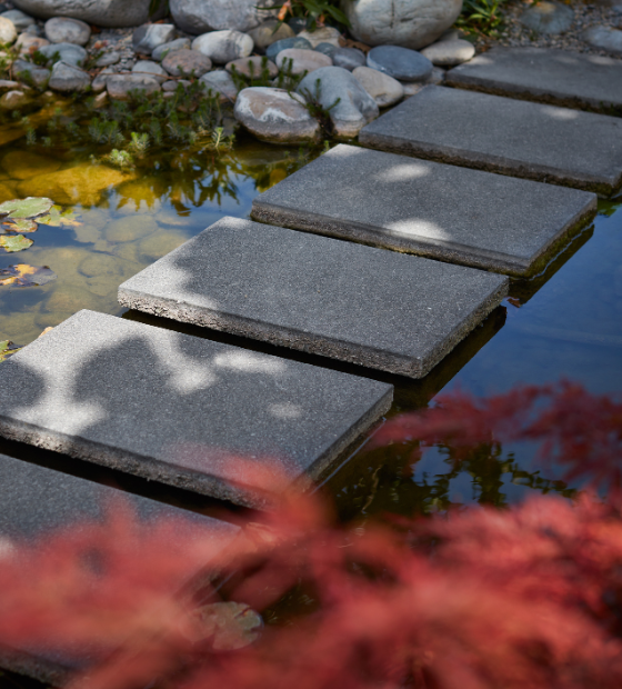 Le bassin constitue le cœur du jardin. Véritable miroir paisible, il accueille le mouvement discret des carpes et installe une atmosphère calme et reposante. Il donne le tempo du lieu, tandis que les pierres, disposées avec précision, structurent les cheminements et affirment la minéralité du projet, renforçant son caractère zen et intemporel.