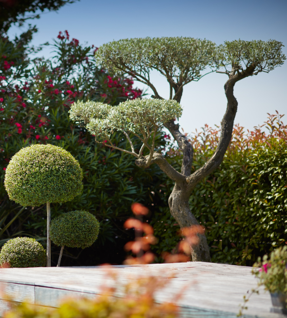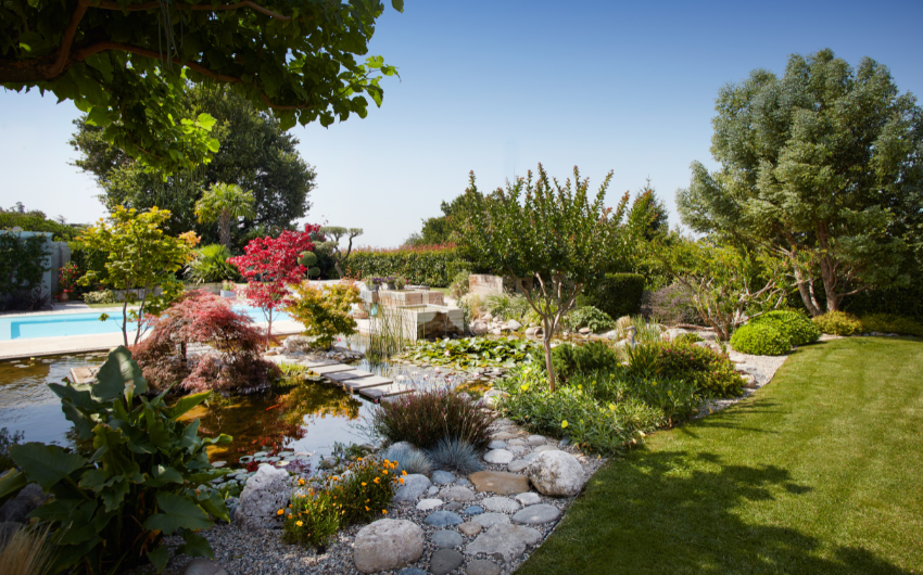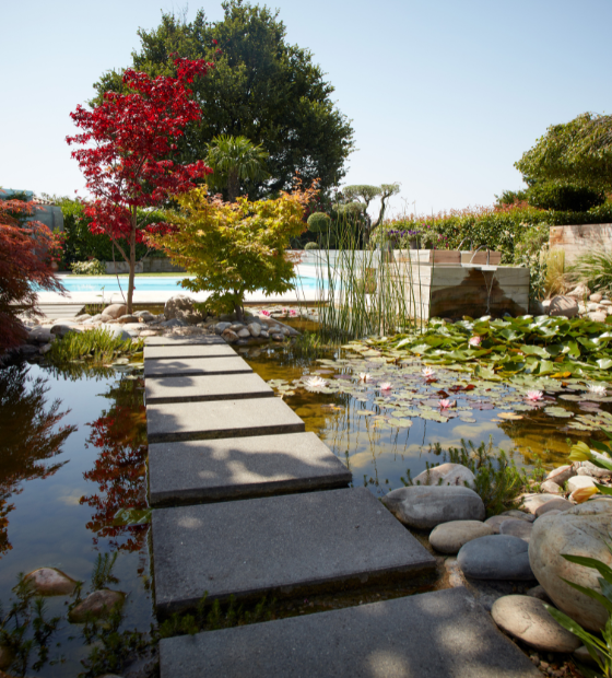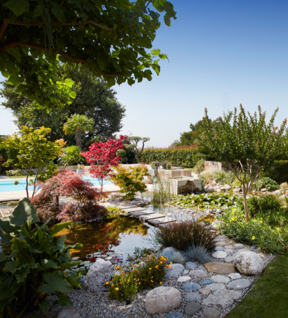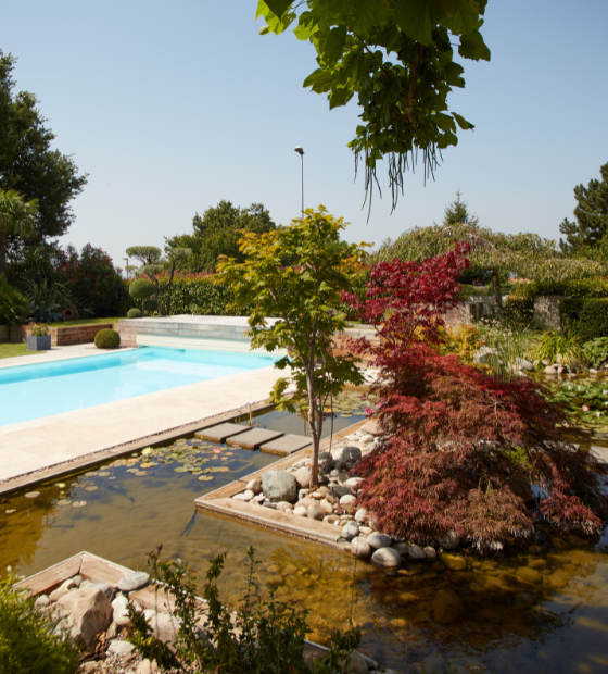 Autour du bassin, les érables, les graminées et les massifs végétaux apportent contrastes, couleurs et légèreté, structurant un aménagement paysager pensé dans le respect du vivant. Le jeu des volumes, des textures et des feuillages crée profondeur et mouvement, faisant évoluer le jardin au fil des saisons tout en conservant une ambiance douce et apaisante, propice au bien-être et à la détente en extérieur.