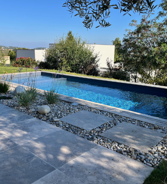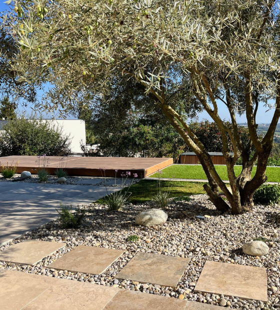 Le végétal vient adoucir l’ensemble : des massifs simples et un olivier mis en valeur apportent de la vie et de la chaleur au jardin. Cet équilibre entre éléments minéraux et végétation bien choisie permet de créer un jardin clair et cohérent, pensé pour évoluer naturellement au fil des saisons et s’adapter aux usages extérieurs du quotidien.