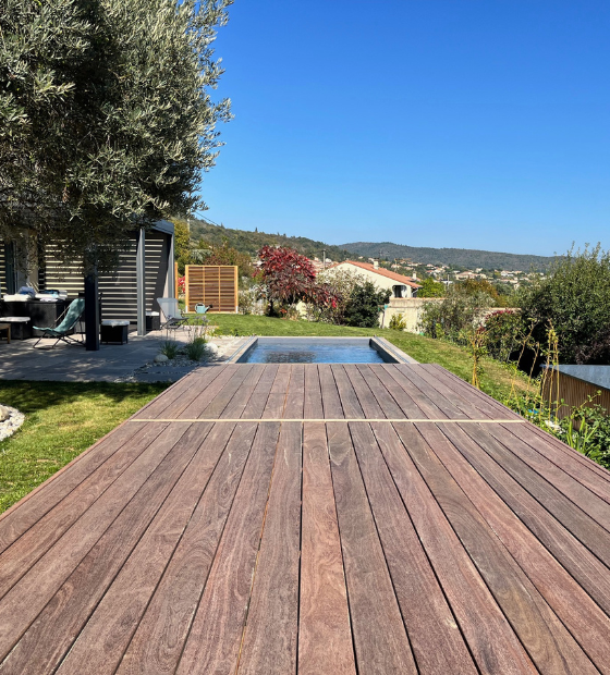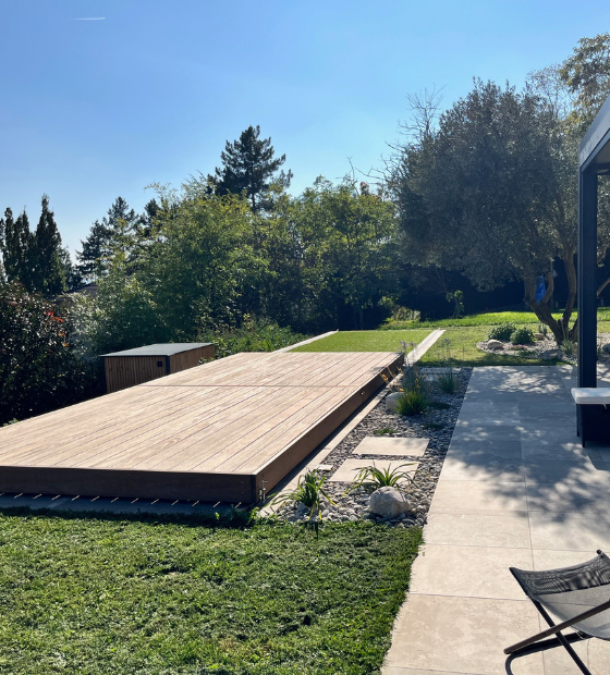 Le jardin « Comme sur des Roulettes » doit son nom à l’élément phare du projet : le Rolling Deck®. Cette plateforme en bois montée sur roulettes permet de fermer la piscine et de la transformer rapidement en terrasse. Une solution simple et maligne, qui s’intègre naturellement à l’esprit du jardin.