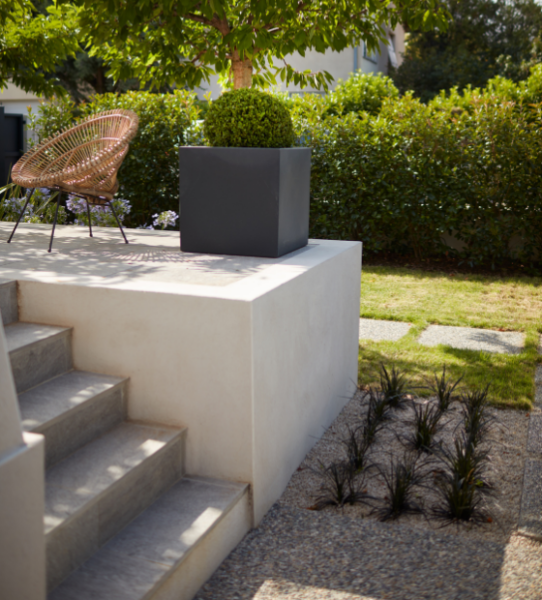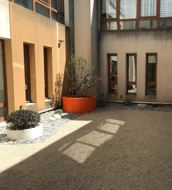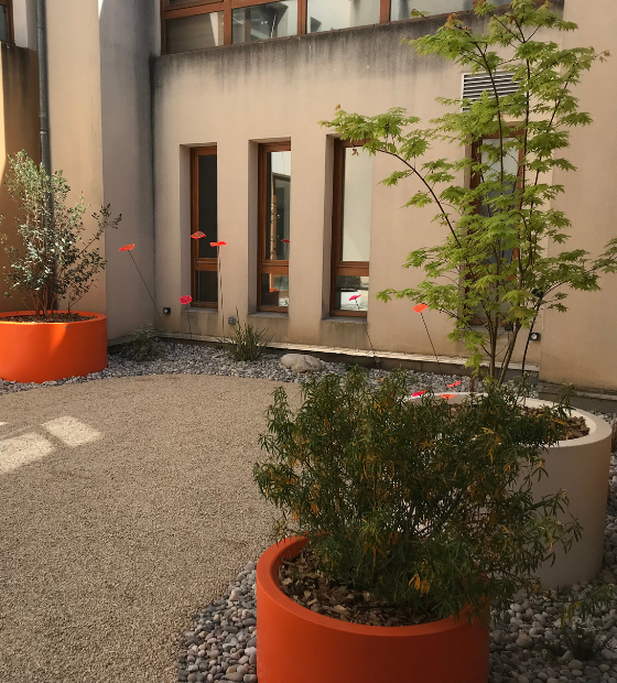 La végétation, installée dans ces grands contenants, apporte fraîcheur, douceur et mouvement. Les plantes sont choisies pour leur facilité d’entretien, leur lisibilité et leur capacité à évoluer au fil des saisons. Elles accompagnent les moments de pause, de discussion et de visite, tout en créant un cadre apaisant.