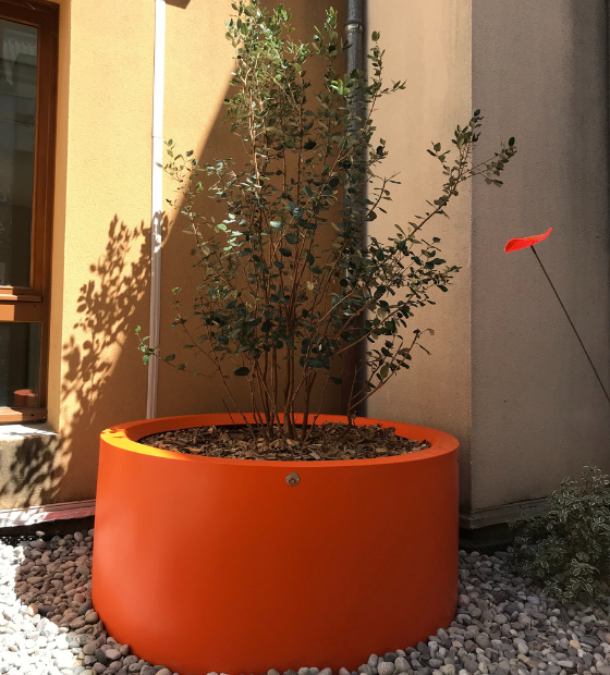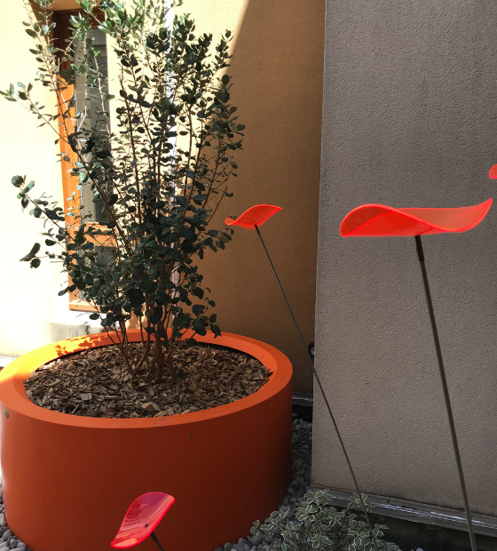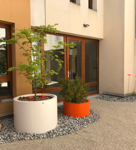 Le projet s’articule autour de grands pots colorés, aux teintes orange et blanches. Ces couleurs vives apportent de la gaieté et attirent naturellement le regard. Elles créent une ambiance positive et stimulante, propice aux rencontres entre résidents, familles et personnel. Les pots structurent l’espace sans le fermer et donnent au patio une identité forte, visible et accueillante.