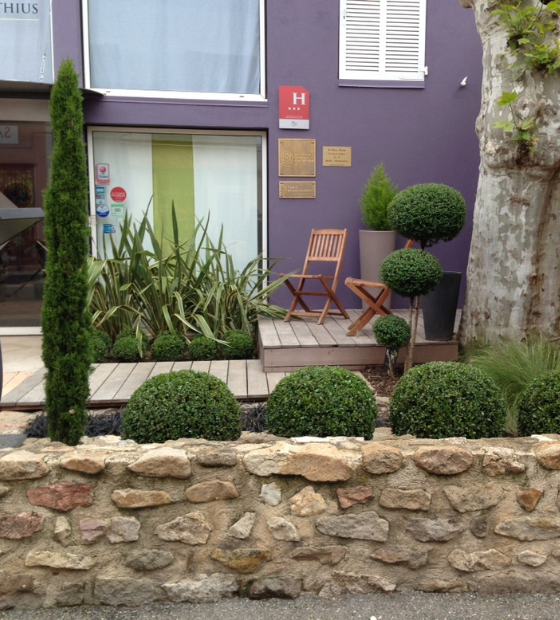 Le jardin « L’Art des Saveurs et du Paysage », réalisé à l’entrée de l’hôtel-restaurant Le Carré d’Alethius à Charmes-sur-Rhône, a été pensé comme une véritable mise en scène de l’accueil. Dès l’arrivée, l’espace accompagne le visiteur et pose l’ambiance du lieu. Plus qu’un simple extérieur, il s’agit d’un espace structuré, pensé dans sa globalité, qui guide le client et crée une transition douce entre la rue et l’univers du restaurant.