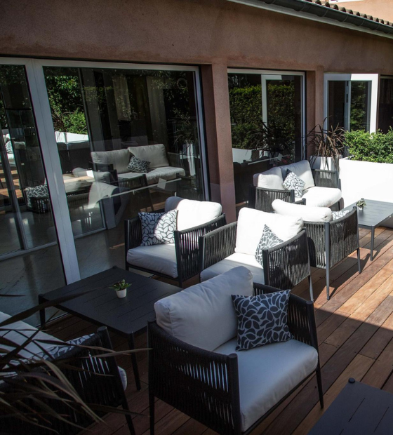 À l’arrière, l’espace se prolonge avec une terrasse en bois, pensée pour accueillir les clients dans un cadre agréable et confortable. Des pots blancs ponctuent l’espace et mettent en valeur la végétation, tandis qu’un panneau bois habillé de plantes structure l’ensemble. Les matériaux, simples et naturels, créent une ambiance chaleureuse et contemporaine.